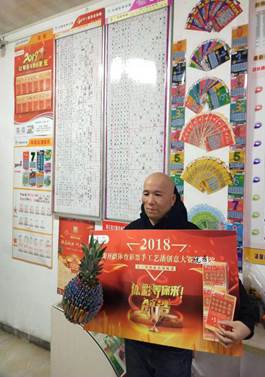 大余县3606006507网点业主吕远琼积极响应活动,收集制作,作品“一帆风顺”从入围赛阶段,到复赛阶段,一路过关斩将最终荣获三等奖。2018年12月11日上午,体彩中心在3606006507网点组织了颁奖仪式并向吕远琼发放了奖品。对于这次获奖吕远琼很是激动,她说开始是抱着重在参与的心态,没想到最终获得了三等奖,非常开心,以后一定积极参与体彩组织的各项活动!