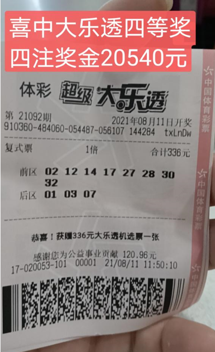 8月11号星期三,这天是活动第一期开奖日,大部分购彩者都习惯选择开奖日当天购买体彩大乐透彩票。鹰潭市的购彩者老秦平时就热衷于购买体彩大乐透,只要是开奖日他都会买一注8+2的体彩大乐透复式票。这天老秦走进鹰潭3617020053体彩门店,还是老规矩打算买8+2的大乐透,代销者连忙向他介绍:“只要参加活动即可随机获得最低3元、最高756元的大乐透机选票一张。”老秦一听,就在后区加了一个数字,这注号码打出来后幸运的获赠336元大乐透机选票一张。当期开奖号码揭晓后,老秦买的票中得奖金20540元。“加了一数字不仅获得了一张赠票,而且还中了奖,运气真不错!”