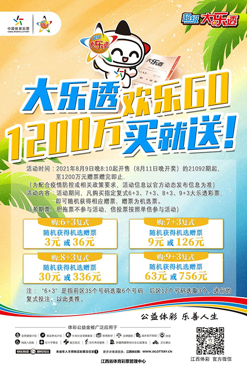 购买指定复式(6+3、7+3、8+3、9+3)大乐透彩票,即可参与活动,随机获得相应金额赠票。购买一张大乐透彩票,获得双份机会,让幸运翻倍,好运加持!