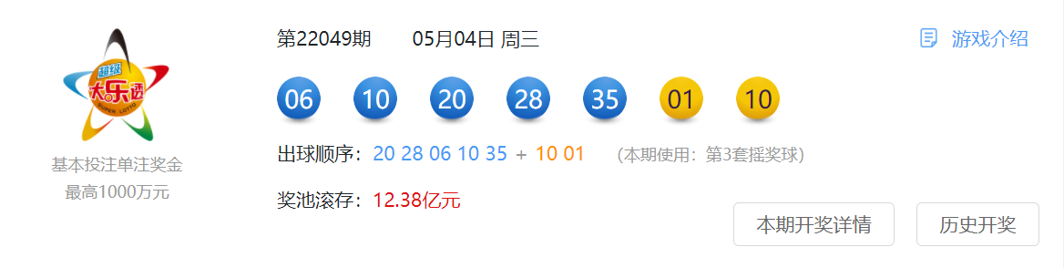 5月4日晚,超级大乐透第22049期开奖,也是超级大乐透10亿大派奖第10期开奖,本期前区开出号码“06、10、20、28、35”,后区开出号码“01、10”。本期全国销量为3.01亿元,为国家筹集彩票公益金1.08亿元。全国中出5注一等奖,其中甘肃省兰州市一幸运儿符合派奖参与条件,独揽本期一等奖派奖奖金,擒获32,999,999元一等奖。