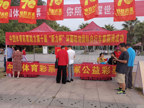 9月17日,2019年第十届环鄱阳湖国际自行车大赛鸣枪开赛,在推动江西省全民健身发展的同时,为市民和游客呈现了一场场别样的山水交响曲和视听盛宴。江西体彩不仅通过体彩公益金支持和助力该项大赛,还在各设区市的11站比赛现场,专门宣传展示了“礼赞70周年 筑梦新时代”、“公益体彩 乐善人生”等国庆主题宣传口号、标语等,大力宣传体育彩票为全省体育事业及社会公共事业做出的积极贡献。