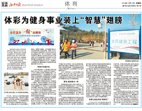 2019年12月12日,江西日报在12版,以“体彩为健身事业装上“智慧”翅膀”为题,报道了江西体育彩票公益金资助全民健身事业的成果。 2019年今年8月,一条长达2 公里的智能步道落户在余干冕山体育公园。下载APP 可随时查看个人运动信息、语音提示科学合理健身动作包括查询运动排名,一系列新潮时尚的健身新方式受到余干县健身群众的欢迎。【点链接查看全文】