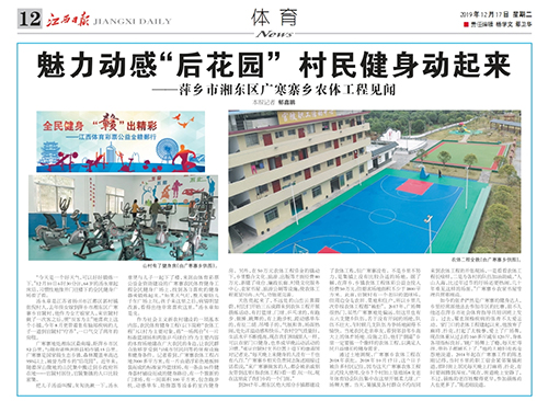 2019年12月17日,江西日报在12版,以“魅力动感‘后花园’村民健身动起来”为题,报道了萍乡市湘东区广寒寨乡在体育彩票公益金资助下建设广寒寨农民体育健身工程,以满足人民日益增长的健身需求。“又是一个好天气,可以好好锻炼一下。”12月10日6时30分许,64岁的汤永章起床后,习惯性地推开门往楼下的全民健身广场看了看。【点链接查看全文】
