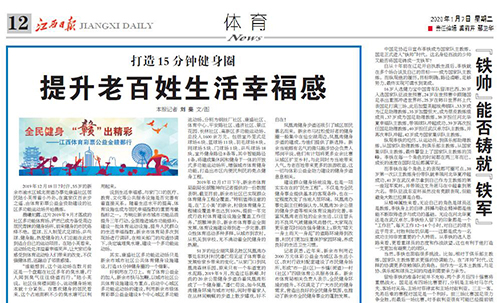 2020年1月7日,江西日报在12版,以“打造15分钟健身圈 提升老百姓生活幸福感”为题,报道了全民健身环境的提升,营造出了良好的全民健身氛围,推动了新余市全民健身事业的蓬勃发展。2019 年12 月18 日7 时许,55 岁的新余市渝水区城北街道办事处康盛社区居民陆小英带着小外孙,在离家仅百余步之遥、由体育彩票公益金资助建设的社区多功能运动场开始晨练。【点链接查看全文】