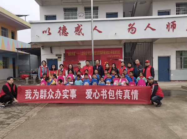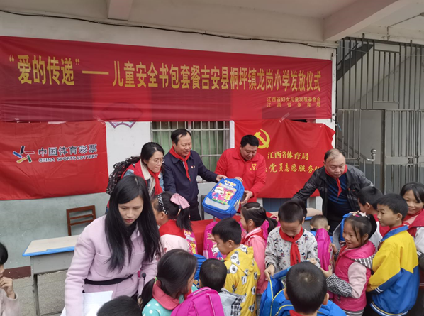 活动现场,省体彩中心党委书记刘极才同参加培训班的党务干部一道将捐赠的安全书包发放给桐坪镇龙岗小学学生们,每套安全书包具有360°全反光,防物体坠落砸伤,救生浮具,求生口哨四大功能,并包含儿童素质教育系列丛书一套和儿童大礼包一份。通过发放儿童安全书包,让孩子们全面学习安全方面的知识,培养少年儿童的公共安全意识和自护自救应变能力。同时,通过捐赠书包的形式,传递爱心,进一步激发孩子们的学习热情,营造全社会关心关注农村留守儿童的良好氛围。
