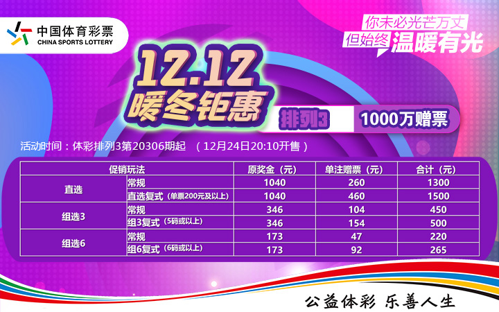 活动时间:排列3第20306期起(12月24日20:10开售,12月25日开奖)——至1000万资金用完即止!