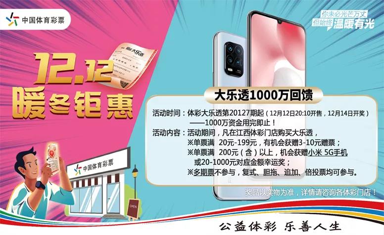 今年双12江西体彩适时推出“责任体彩 暖冬回馈”活动,小米5G手机、各种幸运奖、赠票奖“接踵而至”,众多好礼等您来拿。