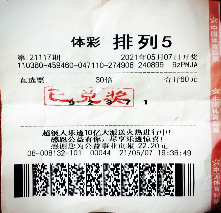 买体彩排列5也能中300万元大奖您听说过吗?答案是肯定的!5月7日晚,江西上饶一购彩者采用30倍的倍投,一举揽获体彩排列5游戏第21117期300万元大奖!
