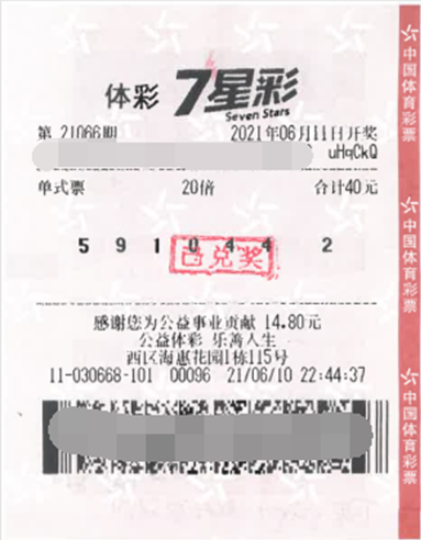 6月11日,7星彩第21066期前区开出号码“5、9、1、0、4、4”,后区开出号码“2”。当期全国共中出21注一等奖,其中惠州大亚湾一幸运儿中得20注一等奖,中奖奖金共计1亿元,不仅打破惠州体彩大奖纪录,也是7星彩史上首个亿元大奖。
