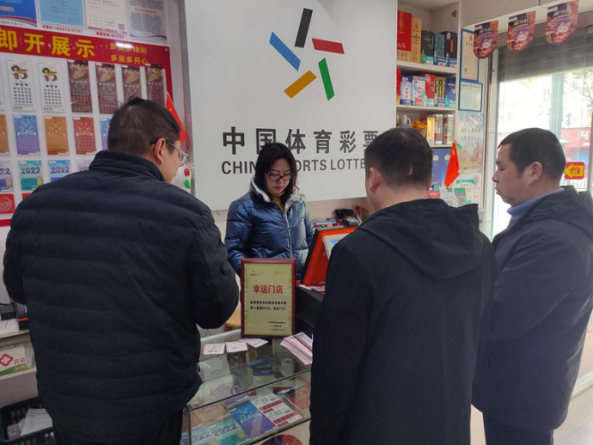 (图为体彩鹰潭分中心工作人员为幸运门店授牌)