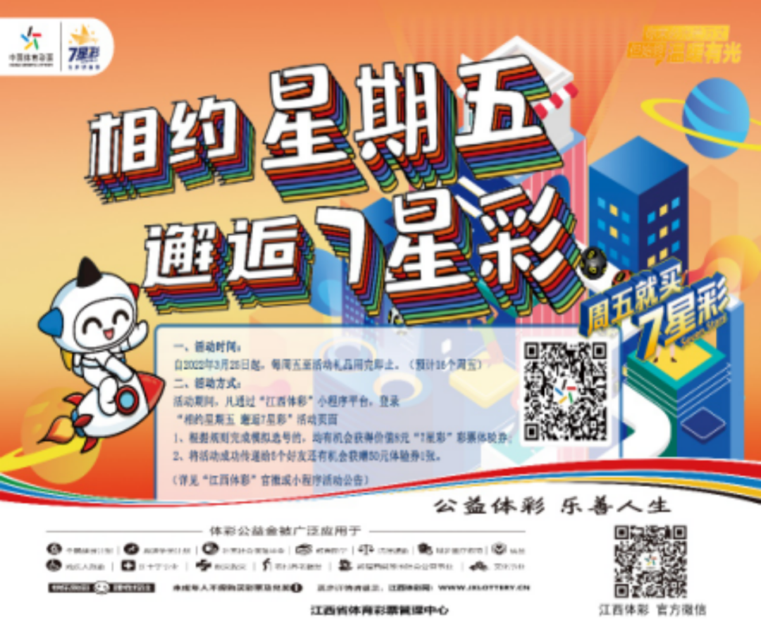 活动期间,凡通过江西体彩小程序平台,登录“相约星期五 邂逅7星彩”活动页面: 根据规则完成模拟选号的有机会获得价值8元“7星彩”彩票体验券;将活动成功传递给5个好友还有机会获赠50元体验券1张。